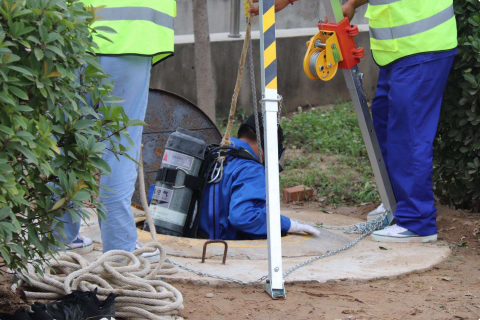 在我們生活中,小區周邊都有各自低下管井,包括下水道、電纜光纜等。其中下井作業(yè)是維保人員工作之一,在井下檢查維修通常需要人員通過(guò)狹小的管道井口進(jìn)入,如果人力吊起安全繩索較為費力,冠航起重三腳架便成為工作人員的得力助手,安裝好后可省心省力的下順道管道井底。